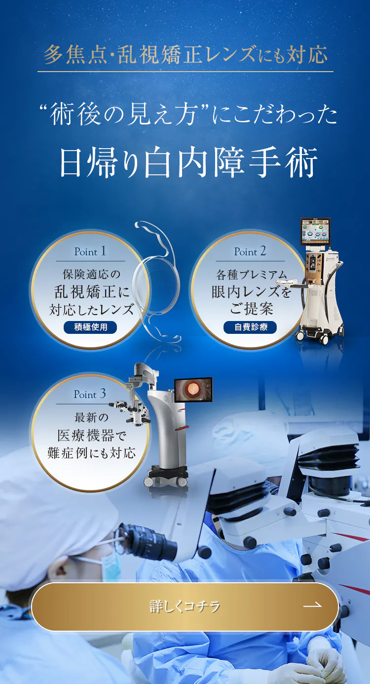 本院では白内障手術のみでも1万件前後の手術を行うことができ、その他にも、網膜硝子体手術や緑内障手術、ICL 手術、眼瞼下垂手術、翼状片手術、霰粒腫手術など、幅広い眼科手術を日々行っております。